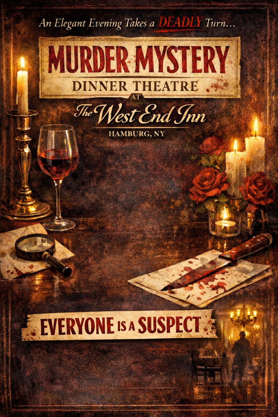 Enjoy a thoughtfully curated buffet of WNY favorites, handcrafted cocktails, and an evening filled with twists, laughter, and shocking revelations, all set within the historic charm of Hamburg’s beloved West End Inn