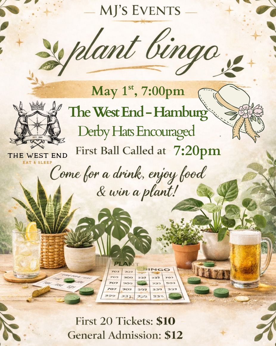 Join us for a fun night of Plant Bingo at The West End in Hamburg, NY on May 1st at 7:00pm.
