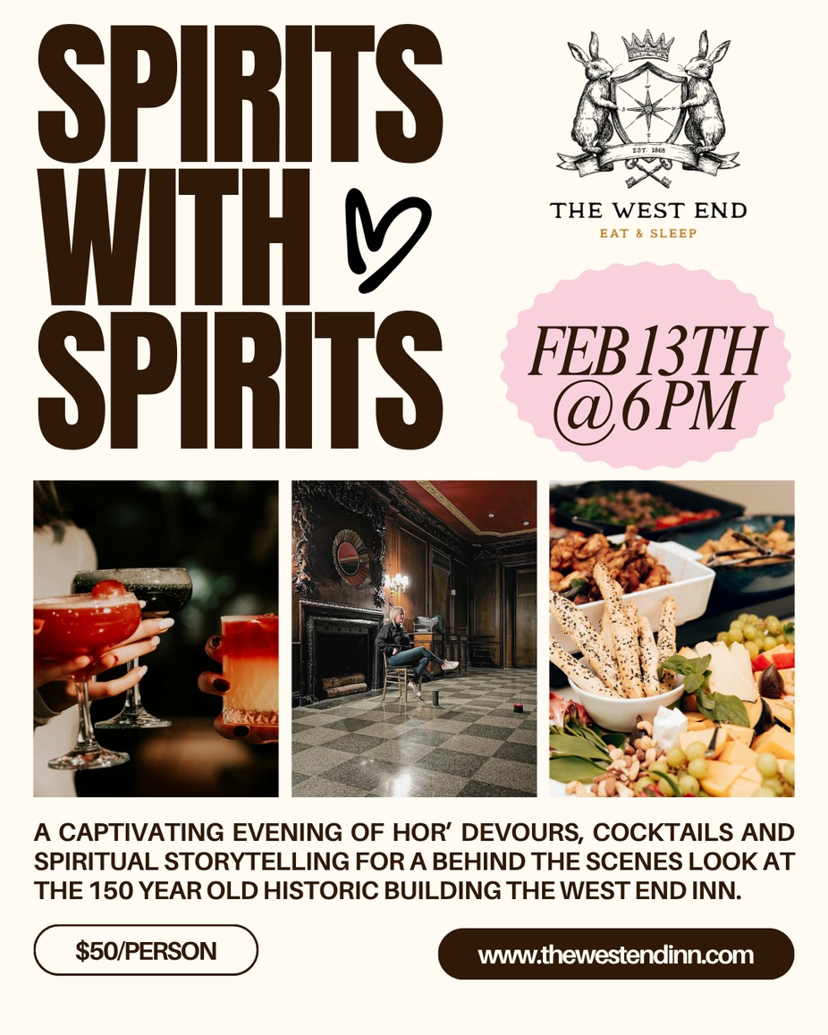 Experience a captivating evening of cocktails with psychic medium Chelsea Gill for one unique Valentines Day evening. A blend of craft cocktails and beer with spiritual insight and storytelling for a true look into the stories within the walls. The night begins with an hour of hors d'oeuvers and drinks followed by a one hour guided spiritual tour and storytelling of the 150 year old historical landmark The West End Inn. Ticket includes hors d'oeuvers display, one drink token and show. Cash bar and full kitchen available if desired.