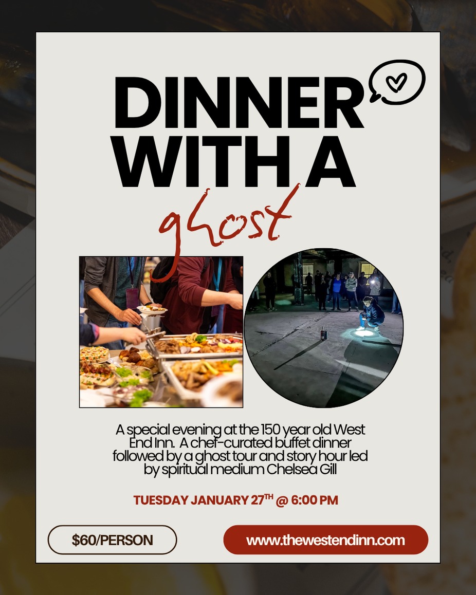 Come have dinner with ghosts in the 150 year old historic West End Inn! Enjoy a chef curated buffet of beef on weck, chicken, roasted potatoes, salad and bread baskets followed by a guided ghost tour and historic storytelling by historian and spiritual medium Chelsea Gill. Ticket includes unlimited buffet and show. Cash bar will be available Information and tickets available here: